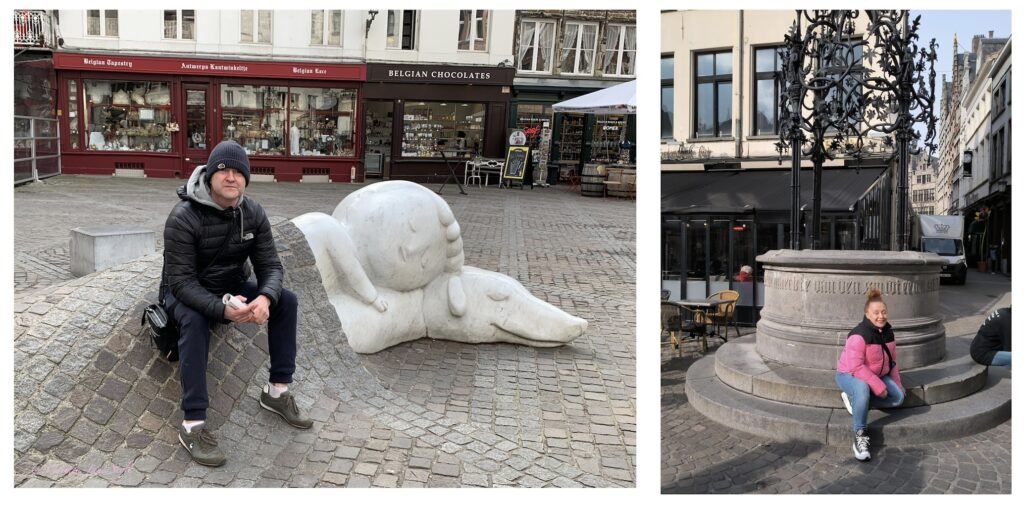 Enfrente de la catedral se encuentra una curiosa escultura realizada por el artista Batist Tist Vermeulen que representa a Nello y su perro Pastrache, dos personajes de una famosa novela juvenil. Los dos aparecen durmiendo cubiertos con una manta, pero realmente, según cuenta la conmovedora historia, ambos están muertos de frío al no poder entrar en la catedral para apreciar los retablos de Rubens por no tener dinero para pagar la entrada. En la plaza también aparece el pozo de Quentyn Massys, que cuenta la bonita leyenda de un herrero que se convirtió en pintor por amor.