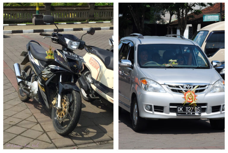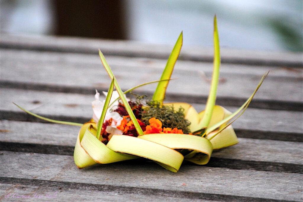 A cada paso encontramos ofrendas realizadas con hoja de palma y decoradas con flores naturales o arroz. Las colocan en farolas, a la puerta de cada tienda, en las casas e incluso en los vehículos: coches o motos.