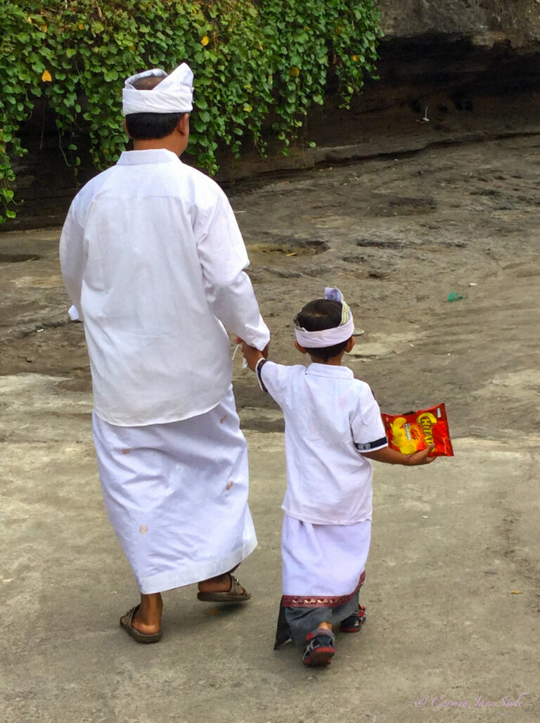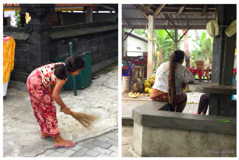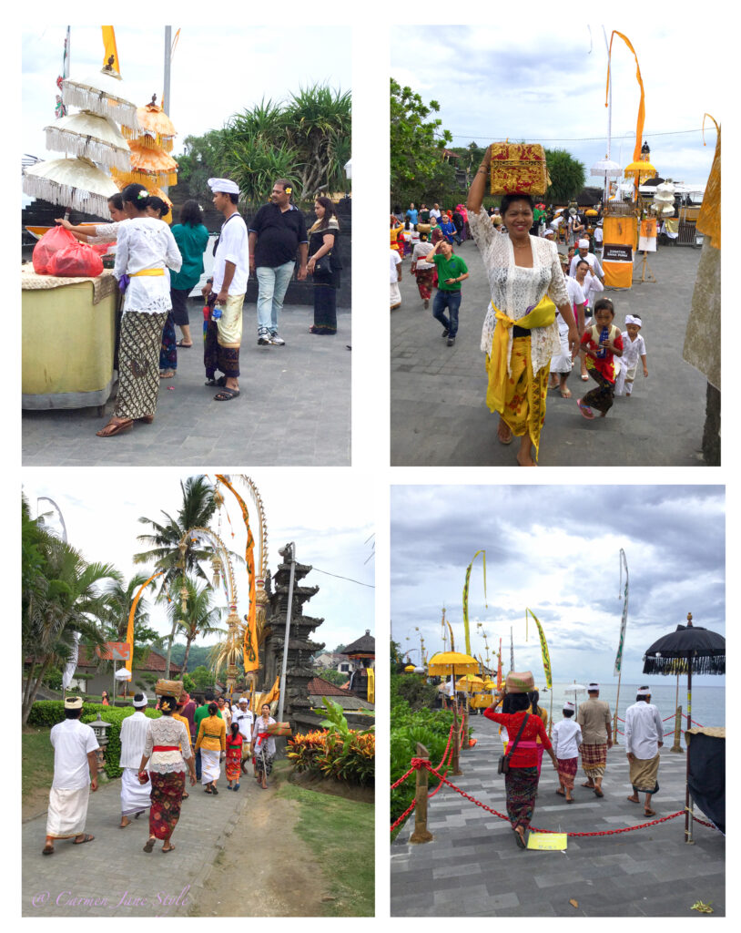 Como diseñadora y estilista no podía dejar de hablar del traje tradicional balinés, que se utiliza especialmente en ocasiones formales o las habituales ceremonias que celebran. Tanto hombres como mujeres visten el “sarong”, que es un rectángulo de tela de diferentes colores y estampados enrollado alrededor de la cadera, a modo de pareo. Las mujeres utilizan una blusa de encaje ajustada (blanca o amarilla) semitransparente, de manga larga, con cuello en V, y cinturón de tela rojo, llamada “keyaba”. Debajo llevan una especie de corsé del mismo color que la blusa llamado “kemban”. Todos los hombres, desde los niños a los ancianos, utilizan un particular tocado denominado “udeng”, que es una especie de turbante en diferentes estampados, que personalmente me fascina.