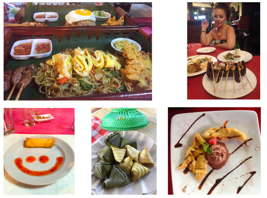La comida balinesa ofrece interesantes sabores y matices muy diferentes a la cocina mediterránea. Destacan las brochetas de carne o de pollo con salsa de cacahuete, gran variedad de mariscos y pescados con salsas picantes y agridulces, y la conocida pasta de arroz frita. Los postres también me han gustado mucho, especialmente el plátano dulce frito en harina de maíz, y otros postres a base de coco, arroz y frutas tropicales.