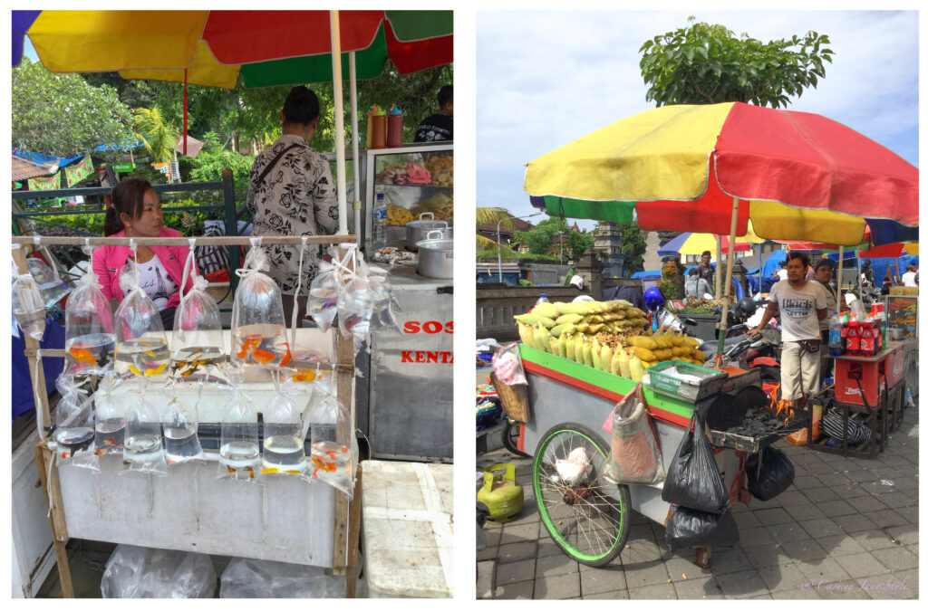 En cada pueblos siempre hay coloridos puestos ambulantes que ofrecen de todo, desde frutas, bebidas, souvenirs, hasta peces.