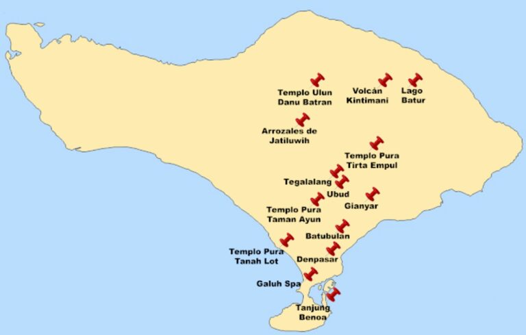 Viajé en el mes de febrero con 2 amigos. El tiempo era perfecto porque evitamos la temporada de lluvias de los monzones. Llegamos al aeropuerto de Denpasar (la capital) después de casi 12 horas de viaje, desde Madrid. Durante los 10 días que permanecimos en la isla visitamos diferentes lugares con excursiones particulares y guías locales a muy buen precio, tras negociar. Adjunto el mapa con los lugares que visitamos: