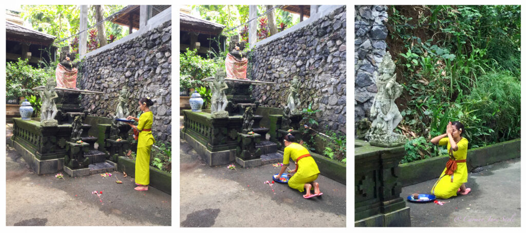 Los balineses son gente muy espiritual. Todos los días le piden a los dioses por un buen trabajo y una vida feliz en armonía familiar. Es muy normal encontrarlos realizando sus oraciones antes de comenzar su jornada laboral.