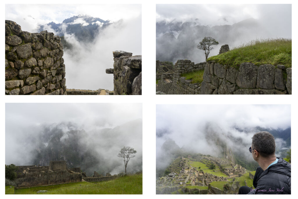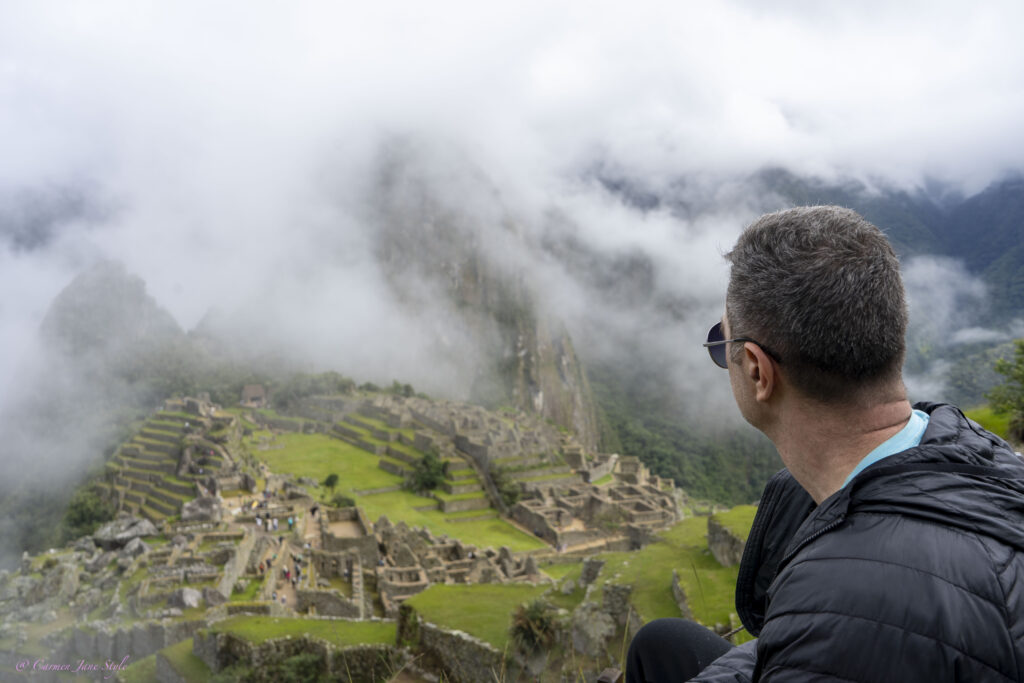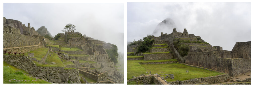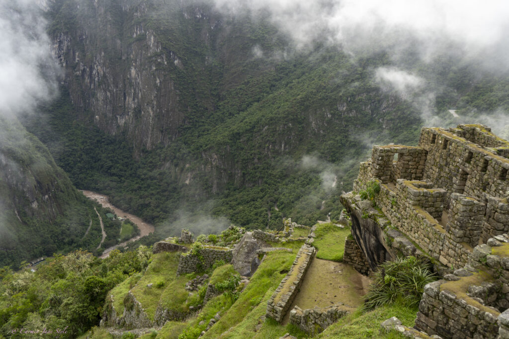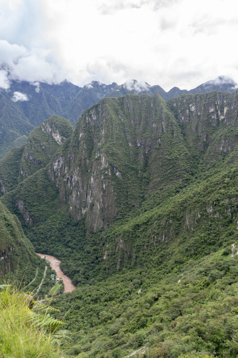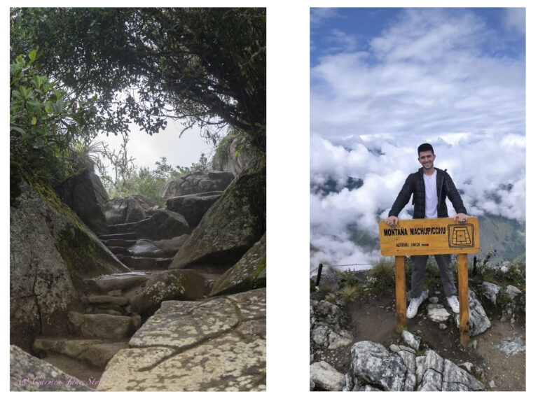 Mi marido y mi hijo subieron a la montaña de Huayna Picchu a 2720 m. que sirvió como centro de vigilancia para la ciudadela. Yo desistí, ya que estaba lloviendo mucho y estaba esperando a que despejara la niebla para hacer fotografías de las ruinas. El camino de subida por la montaña es a base de escaleras casi verticales en zigzag con numerosos precipicios realmente vertiginosos. Tardaron en alcanzar la cima 1h y media, y 1 hora en bajar. La verdad es que ahora me da pena no haber subido, porque las vistas son impresionantes.