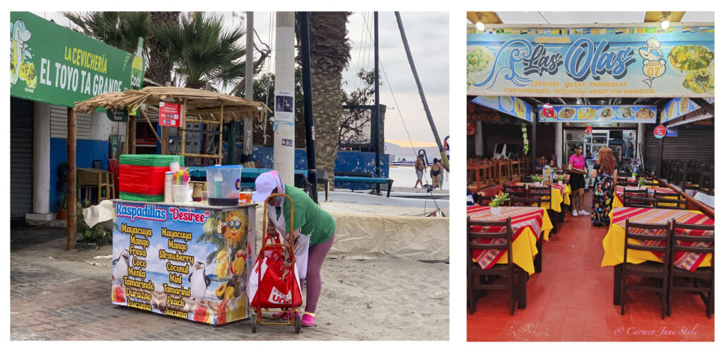 Te recomiendo atravesar el malecón hasta el final y comer en los pequeños restaurantes locales bajo los toldos, ya que te sorprenderás. Nosotros nunca hemos comido un ceviche más rico y bien sazonado.
