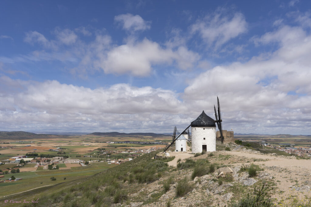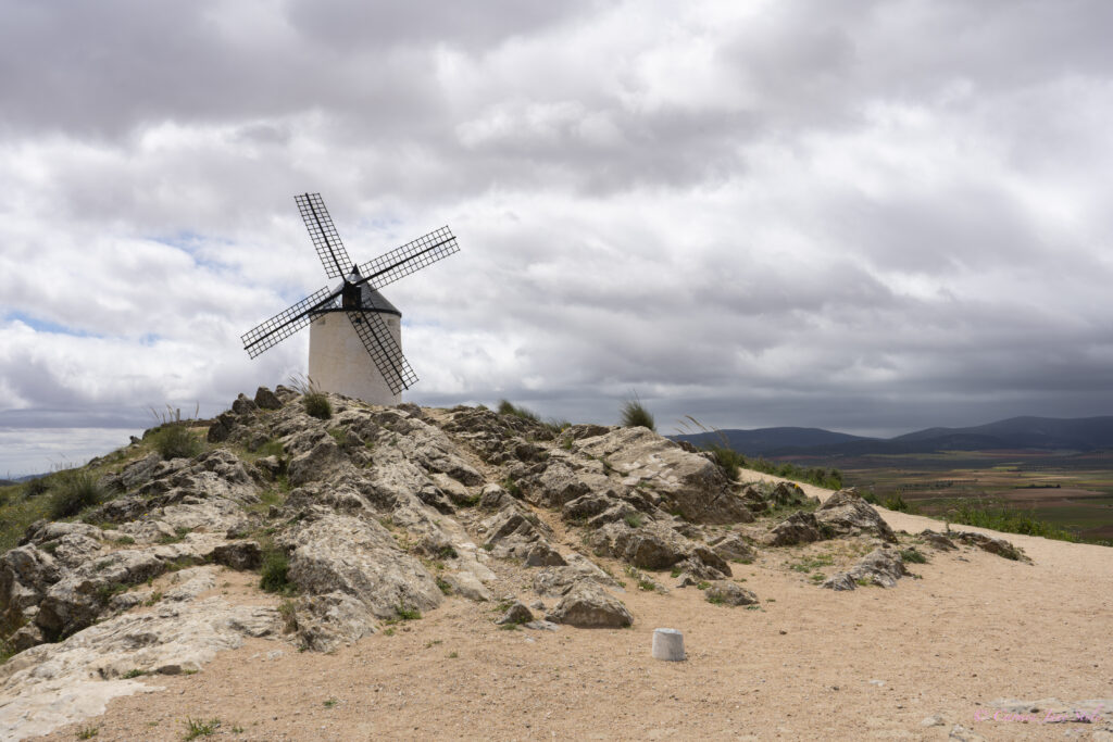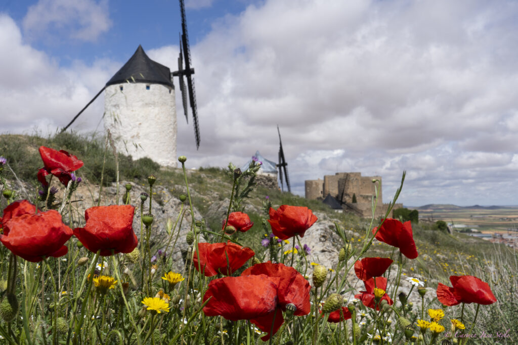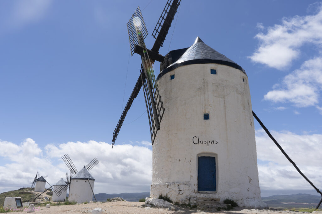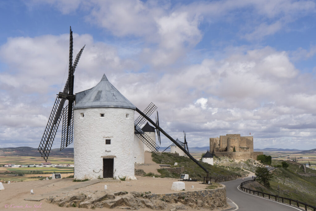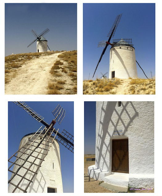 A 21 kms de Mota del Cuervo llegamos a la localidad de Campo de Criptana en la provincia de Ciudad Real. Sobre las colinas encontramos diez impresionantes molinos de viento, tres de ellos originales del siglo XVI. Todos ellos han sido catalogados Bien de Interés Cultural. Cuentan las historias populares que éstos fueron los molinos que inspiraron a Cervantes a escribir el famoso capítulo VIII, de la primera parte de El Quijote, donde el ilustre caballero los confunde con gigantes.