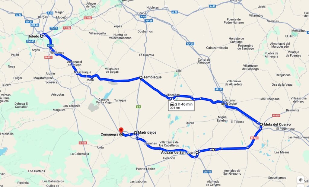 Los molinos se encuentran dispersos en varios pueblos de las provincias de Toledo, Ciudad Real y Cuenca entre extensas llanuras y coronando los cerros de la Mancha. Alberto y yo realizamos nuestra primera ruta juntos, inaugurando así nuestras infinitas aventuras. A continuación os muestro el itinerario que nos llevó unas 3 horas y media, ida y vuelta en coche, sin contar el tiempo que paramos en cada uno de los sitios. Realmente la escapada está pensada para hacerla en un solo día, con tranquilidad, saliendo por la mañana desde Toledo o Madrid, y regresando al finalizar la tarde.